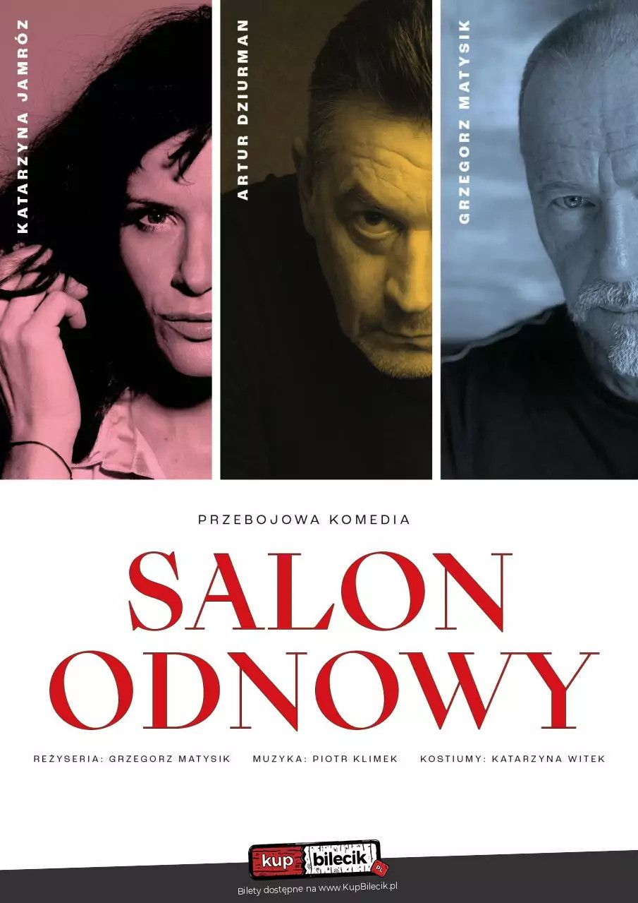 bilety: Dwóch niezadowolonych z życia mężczyzn, w dojrzałym wieku, trafia do Salonu Odnowy, prowadzonego przez tajemniczą, piękną kobietę. Za pomocą różnych zabiegów, stara się ona przywrócić obu panom wiarę w sens życia. Cała historia przepełniona jest humorem oraz zabawnymi zwrotami akcji. Atmosferę spektaklu podkreślają przebojowe i nieco żartobliwe piosenki, śpiewane przez właścicielkę salonu. Bilety do nabycia na: KupBilecik.plSalon Odnowy artyści: Katarzyna Jamróz, Artur Dziurman, Grzegorz MatysikDwóch niezadowolonych z życia mężczyzn, w dojrzałym wieku, trafia do SALONU ODNOWY, prowadzonego przez tajemniczą, piękną kobietę, której życie również nie rozpieszczało. Za pomocą różnych zabiegów próbuje ona przywrócić obu panom wiarę w sens życia. Odnowa duchowa, której są poddawani, odkrywa przed nimi nieznane światy i prowadzi do zaskakującego finału. Cała historia przepełniona jest inteligentnym humorem oraz zabawnymi zwrotami akcji. Występują w niej również elementy interakcji z publicznością. Aktorzy wcielając się w swoje role, bawią się z widzami, nie naruszając jednak granic ich prywatności. Atmosferę spektaklu podkreślają przebojowe i nieco żartobliwe piosenki, śpiewane przez właścicielkę salonu. Bilety do nabycia na: KupBilecik.pl |
